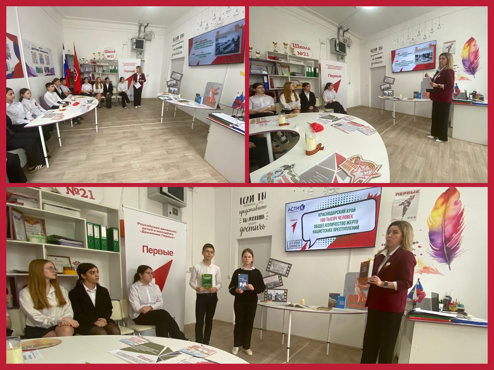 19 апреля по всей России чтят память о геноциде советского народа нацистами и их пособниками в годы Великой Отечественной войны и объединяются в борьбе с любыми современными проявлениями нацизма и геноцида. Этой дате, Году защитника Отечества и 80-летию Великой Победы был посвящен час исторической хроники «Живи и помни», организованный 17 апреля 2025 года филиалом МБУК «Роговская библиотека» совместно с советником директора по воспитанию Глоба О.П. в МБОУ ООШ №21. Мероприятие прошло в рамках научно-просветительского проекта «Без срока давности».