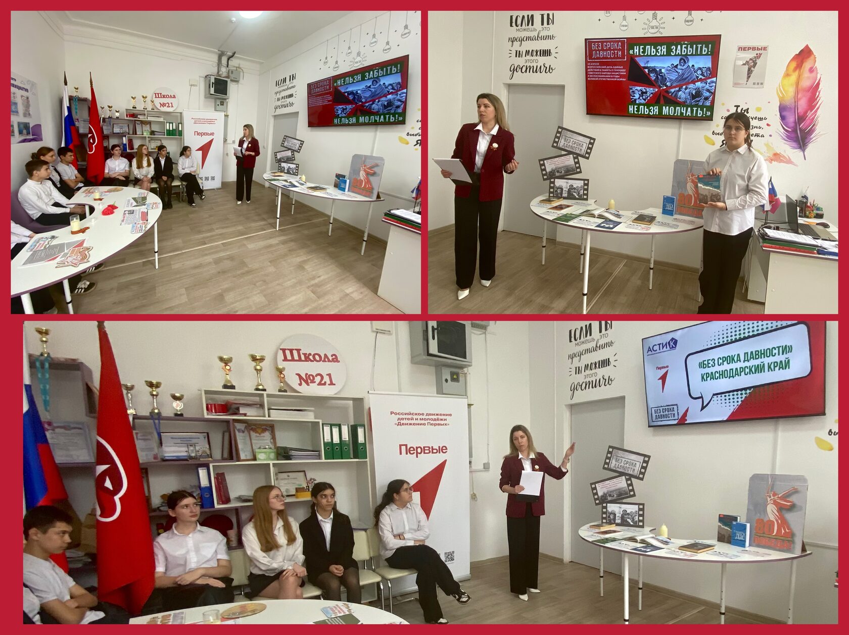 Исторический хронограф перенес участников в 1943 год, когда по мере освобождения оккупированной нацистами Кубани стал очевиден масштаб преступлений против мирного населения. Из слайд-обзора «Нельзя забыть! Нельзя молчать!» старшеклассники узнали о жесточайших злодеяниях фашистов на родной земле и фактах массового истребления ни в чем неповинных граждан. Дополнила материал книжно-иллюстративная выставка «Без срока давности». В память о жертвах геноцида советского народа прошла минута молчания. Завершилось мероприятие призывом знать и помнить трагические страницы истории, эту страшную правду во имя сильной, непобедимой России, во имя будущего!