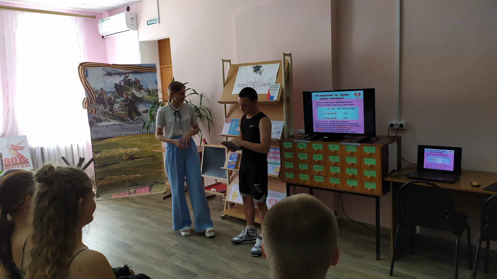 В начале мероприятия с помощью слайд-презентации «Закон на защите детства» библиотекарь познакомила ребят с основными положениями Закона № 1539-КЗ, особое внимание ведущая уделила правилам безопасного поведения в общественных местах, рассказала о символе и слогане присвоенного этому закону, а также о его основной цели – осуществлении безопасности несовершеннолетних. После чего подростки разобрали и обсудили различные ситуации и конкретные примеры действия закона. При помощи книжной выставки «Подросток и закон» учащиеся познакомились с другими своими правами и обязанностями.