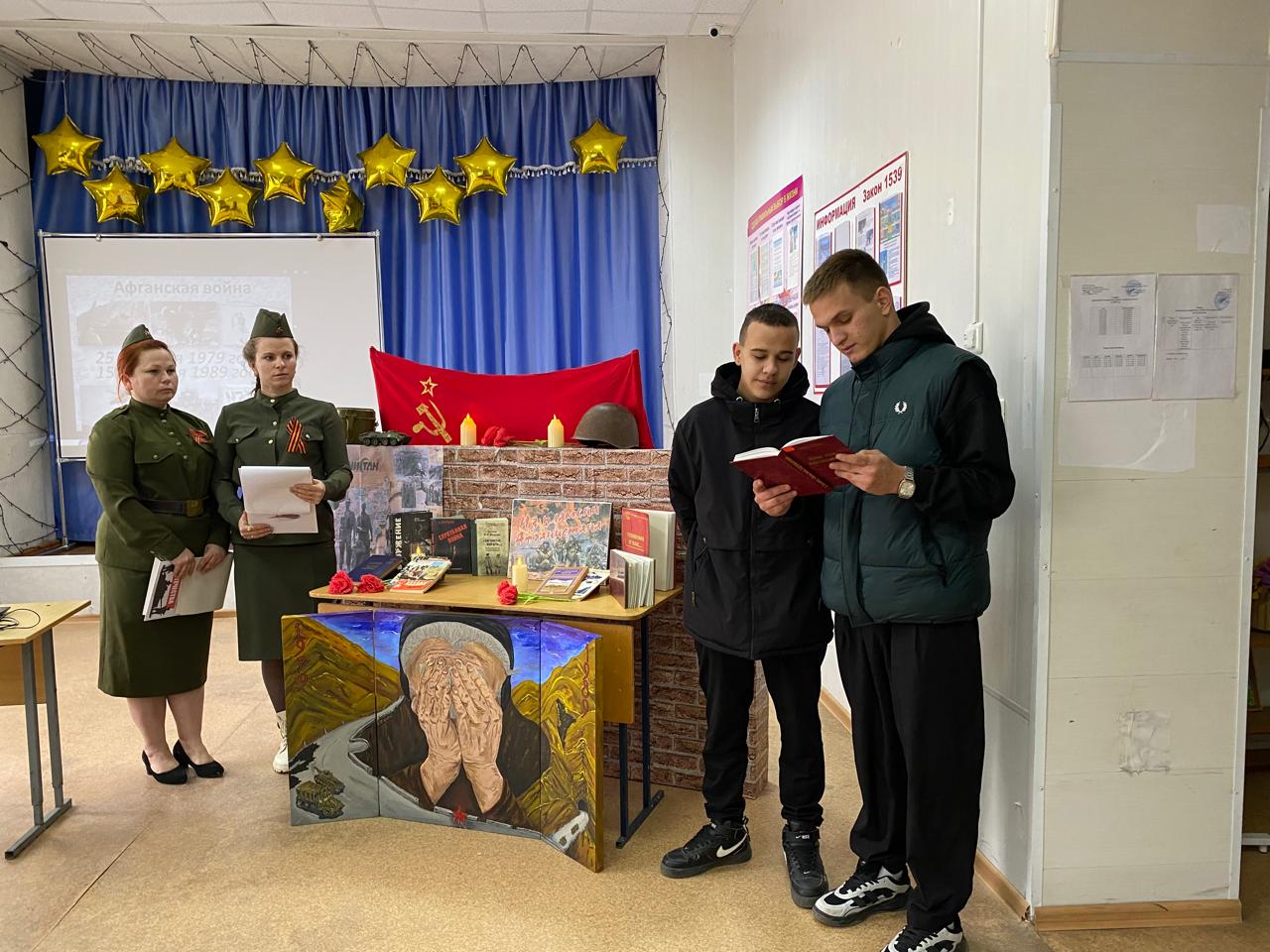На мероприятии школьники познакомились с причинами ввода советских войск в Афганистан, узнали о ходе боевых действий и последствиях войны для обеих стран. Информационное сопровождение обеспечила мультимедийная презентация «Война в Афганистане» и видеокадры, на которых ветераны делятся своими воспоминаниями. Особую атмосферу вечера создавали стихи и песни, посвященные афганским событиям. Не осталась без внимания книжно – иллюстрационная выставка «Из пламени Афганистана». Завершилась встреча минутой молчания.