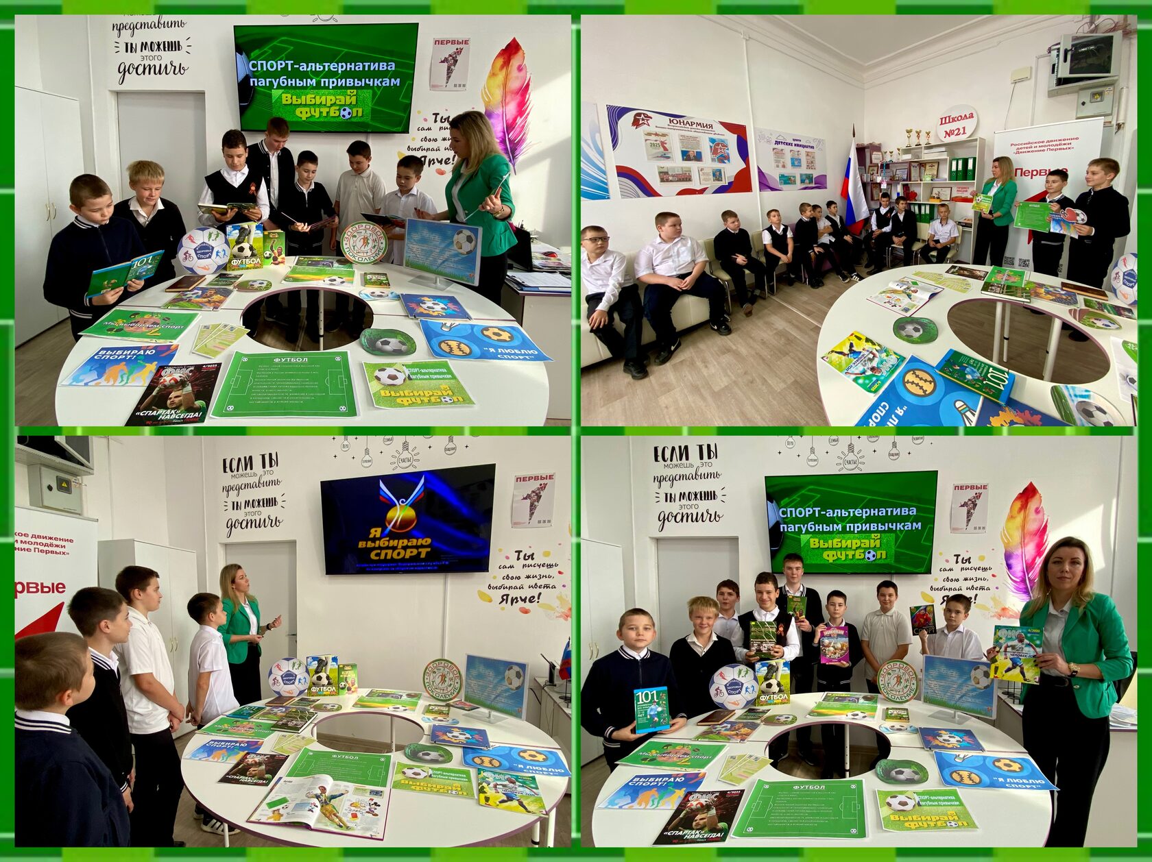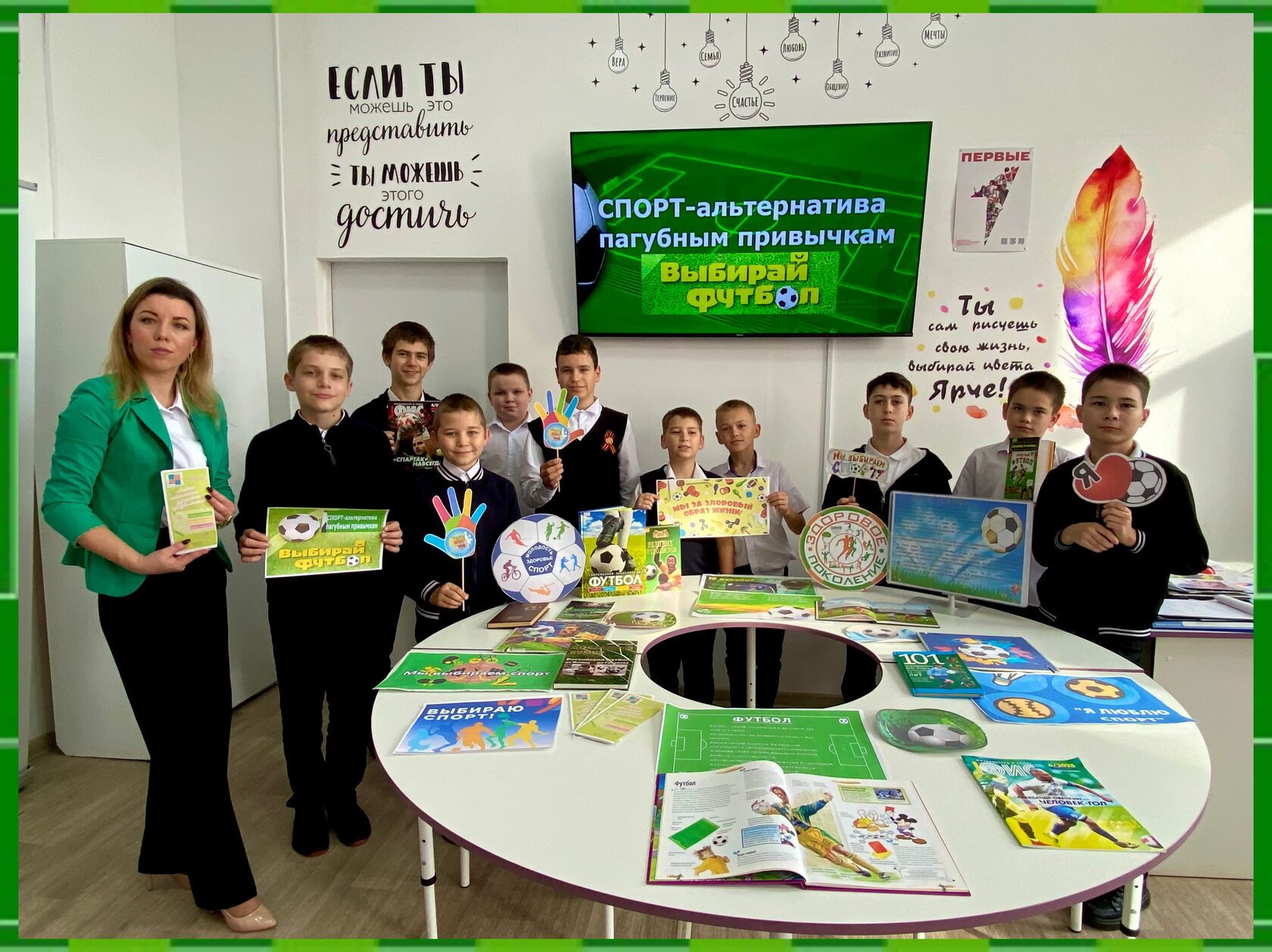 Школьникам рассказали, что в футболе сочетается активность и динамичность, лидерство каждого участника и мощный командный дух. Ребята узнали много нового и интересного об игре, просмотрели ролик «О спорте», а также поучаствовали в блиц-викторине «Азбука футбола» и получили буклеты про ЗОЖ. Ярким акцентом мероприятия стала выставка «Мы за здоровый образ жизни!» и слайд-журнал «Спорт – альтернатива вредным привычкам».