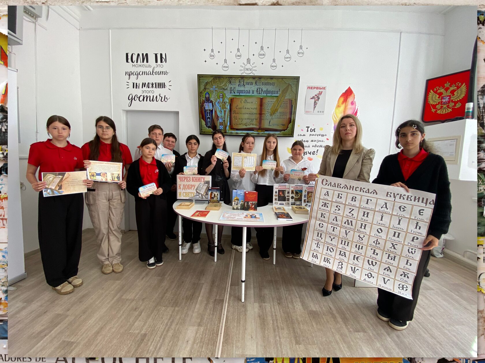 В ходе мероприятия старшеклассникам была представлена информация об истоках праздника и жизненном пути святых братьев Кирилла и Мефодия, которые на основе греческого письма создали первый славянский алфавит и перевели Евангелие на славянский язык. Ребята проследили историю развития письменности и книгопечатания, познакомились с различными алфавитами и их особенностями, прочли стихи, прославляющие великих просветителей. Дополнял материал слайд-журнал «Подвиг славянских первоучителей» и книжно-иллюстративная выставка «Через книгу к добру и свету». Мероприятие напомнило старшеклассникам о великом наследии славянской культуры как части православной традиции, как основоположницы культуры русской.