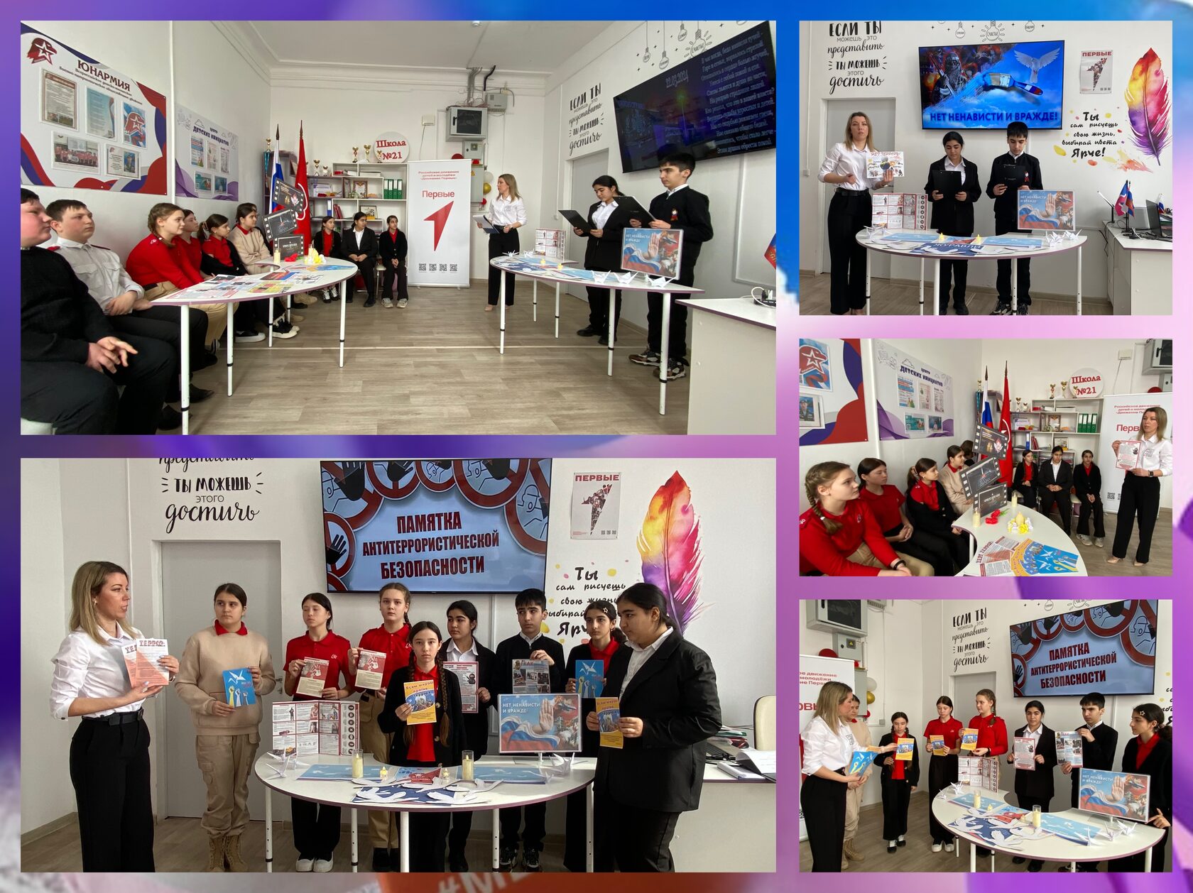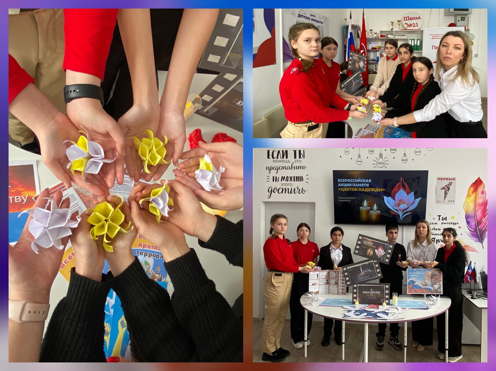 Учащимся рассказали о крупнейшем теракте в подмосковном «Крокус Сити Холле», напомнили о мерах предосторожности в связи с возросшим риском террористической угрозы на территории России. Дополнял материал слайд-журнал и книжно-иллюстративная выставка «Нет ненависти и вражде!», видеоролик «Бдительность» и памятка «Мы за мир!».Символами единства нашей многонациональной страны, символами скорби о безвинно погибших стали изготовленные из бумаги цветки крокуса и белые журавли, улетающие в небо. В завершении память о жертвах терактов почтили минутой молчания.